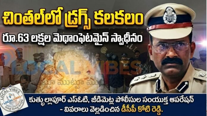 లోకల్ వైబ్స్, జీడిమెట్ల: యువతే టార్గెట్‌గా సాగుతున్న మత్తు దందాకు పోలీసులు చెక్ పెట్టారు. నిన్నటి దాకా గంజాయితో పట్టుబడిన స్మగ్లర్లు, ఇప్పుడు అత్యంత ఖరీదైన డ్రగ్స్‌ను నగరంలోకి దించుతున్నారు. తాజాగా చింతల్ సమీపంలో కుత్బుల్లాపూర్ ఎస్ఓటీ (SOT), జీడిమెట్ల పోలీసులు సంయుక్తంగా నిర్వహించిన ఆపరేషన్‌లో ఏకంగా రూ. 63 లక్షలకు పైగా విలువైన ‘మెథాంఫెటమైన్‘ (Methamphetamine) పట్టుబడటం స్థానికంగా తీవ్ర కలకలం రేపుతోంది. ఈ అంశంపై కుత్బుల్లాపూర్ జోన్ డిసిపి కార్యాలయంలో శనివారం నిర్వహించిన మీడియా సమావేశంలో డిసిపి కోటిరెడ్డి వివరాలను తెలియజేశారు. అడిషనల్ డీసీపీ పురుషోత్తమరావు, ఏసిపి బాలగంగి రెడ్డి, ఎస్ఓటి అడిషనల్ డీసీపీ విశ్వప్రసాద్, జీడిమెట్ల సీఐ గడ్డం మల్లేష్, ఎస్ఓటి సిఐ శ్యాంప్రసాద్, ఎస్ఓటి ఎస్ఐ రామనారాయణ , సిబ్బంది పాల్గొన్నారు..