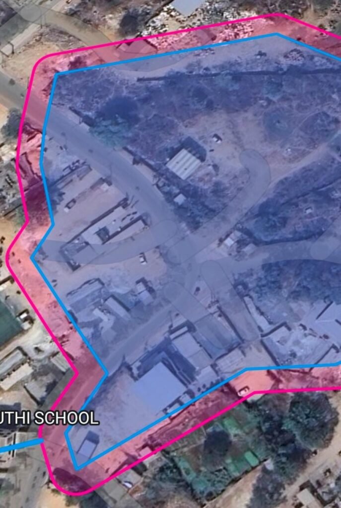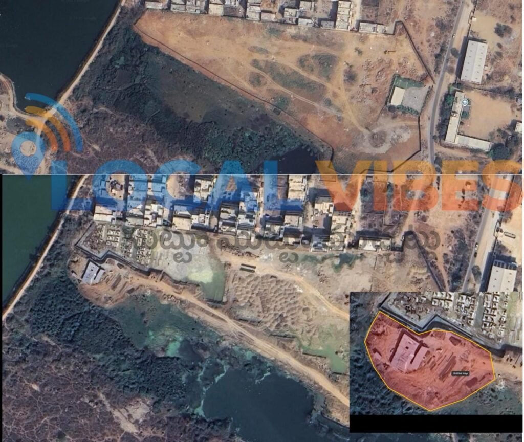 సాటిలైట్ చిత్రాలలో స్పష్టంగా చెరువును పూడ్చినట్లుగా తెలుస్తుంది. (ఇన్సర్ట్ గురైన భాగం)