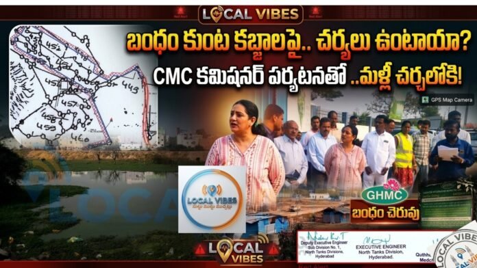 లోకల్ వైబ్స్, గాజులరామారాం: సైబరాబాద్ మున్సిపల్ కార్పొరేషన్ కమిషనర్ డాక్టర్ జి సృజన (ఐ ఎ ఎస్) మంగళవారం కుత్బుల్లాపూర్ మండలం గాజులరామారం లో ఉన్న “బంధం కుంట” చెరువు పరిసర ప్రాంతాలను క్షేత్రస్థాయిలో పరిశీలించారు. సమీపంలో ఉన్న వోక్షిత్ హిల్ వ్యూ కాలనీ వాసుల ఫిర్యాదు తో కమిషనర్ ఉన్నతాధికారుల బృందంతో పరిశీలించి రెవెన్యూ, ఇరిగేషన్ అధికారుల తో సమన్వయం చేసుకొని చెరువు యొక్క హద్దులను గుర్తించాలని స్పష్టంగా సూచించారు. అయితే కమిషనర్ పర్యటనతో మరోసారి గాజులరామారం బంధం కుంట చెరువు కబ్జాల వ్యవహారం మరోసారి వెలుగులోకి వచ్చినట్లయింది. ఇప్పటికే ఈ చెరువు కబ్జాల వ్యవహారంలో స్థానిక రెవిన్యూ అధికారులతో పాటుగా సైబరాబాద్ మున్సిపల్ కార్పొరేషన్ ఏర్పడక ముందు ఉన్న గాజులరామారం సర్కిల్ డిప్యూటీ కమిషనర్ కూడా స్థానికులు ఫిర్యాదు చేసిన ఇప్పటి వరకు ఆ ఫిర్యాదులపై స్పందన లేదు. ఒకసారి బంధం కుంట చెరువు ఆక్రమణల అంశాల పై వస్తున్న ఆరోపణలను పరిశీలిస్తే…