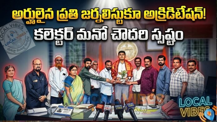 లోకల్ వైబ్స్, మేడ్చల్ జిల్లా కలెక్టరేట్: జిల్లాలో విధులు నిర్వర్తిస్తున్న వర్కింగ్ జర్నలిస్టులకు అక్రిడిటేషన్ కార్డులు మంజూరు చేసే ప్రక్రియలో నిబంధనలకు లోబడి వ్యవహరించాలని మేడ్చల్ మల్కాజిగిరి జిల్లా కలెక్టర్ మనో చౌదరి పేర్కొన్నారు. గురువారం జిల్లా మీడియా అక్రిడిటేషన్ కమిటీ ప్రతినిధులు కలెక్టరేట్ను ఆయన కార్యాలయంలో మర్యాదపూర్వకంగా కలుసుకున్నారు.జిల్లాలో క్షేత్రస్థాయిలో పనిచేస్తున్న నిజమైన జర్నలిస్టులందరికీ త్వరితగతిన అక్రిడిటేషన్లు అందించాలని వారు కలెక్టర్కు విజ్ఞప్తి చేశారు. దీనిపై సానుకూలంగా స్పందించిన ఆయన ప్రభుత్వ నిబంధనల (జీవో) ప్రకారం అర్హత ఉన్న ప్రతి ఒక్కరికీ కార్డులు మంజూరు చేస్తామని భరోసా ఇచ్చారు.