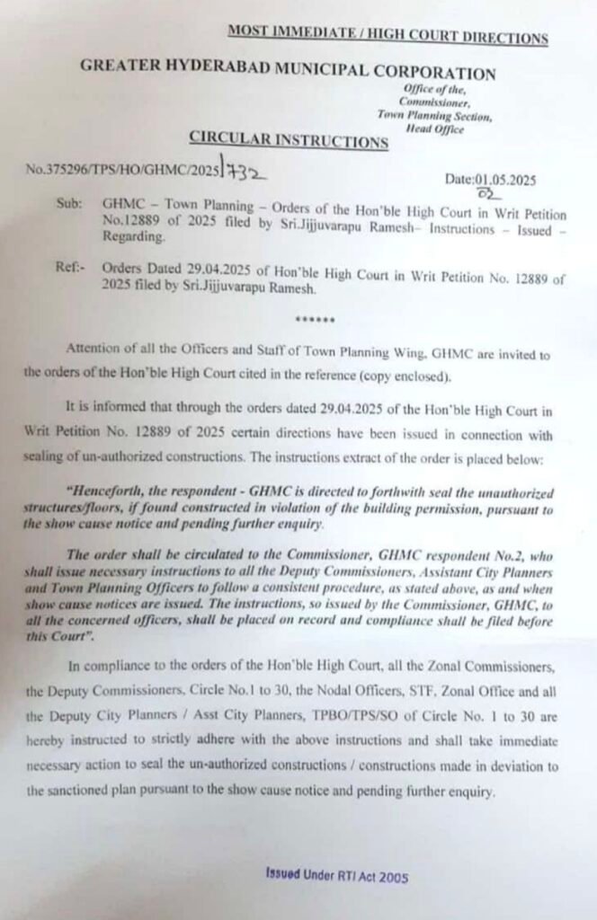 _ హైకోర్టు ఆదేశాల అమలుకై అప్పటి జీహెచ్ఎంసీ కమిషనర్ జారీ చేసిన సర్క్యులర్ (నెం.375296)ను సైతం ఖాతరు చేయని జీడిమెట్ల సర్కిల్ టౌన్ ప్లానింగ్ అధికారులు..