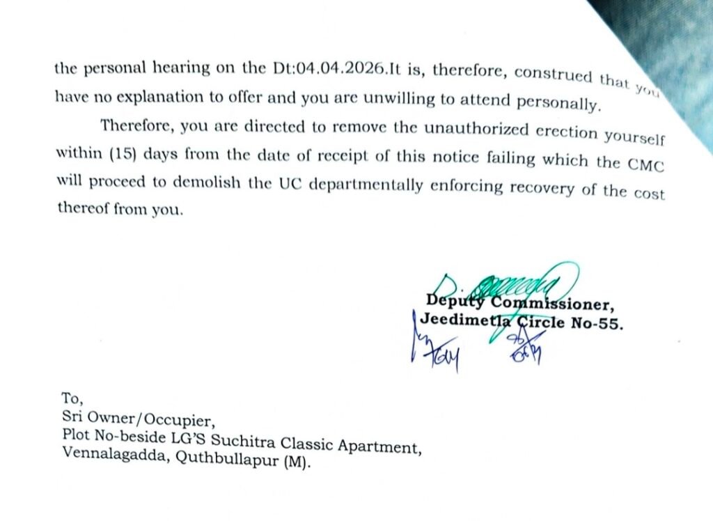 _ ఏప్రిల్ 06, 2026న ఫైనల్ నోటీసు (12946/UC/2026) ఇచ్చి, కూల్చివేతకు మరో 15 రోజుల గడువు ఇస్తూ అక్రమార్కులకు అండగా అధికారులు..?